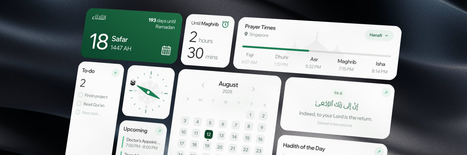 Bento box-style grid to showcase widgets.Tools like the to-do list and Google Calendar feed are built directly into the dashboard, allowing tasks and events to sit alongside spiritual reminders. This design choice makes DeenBoard a holistic daily companion rather than just a static religious utility.