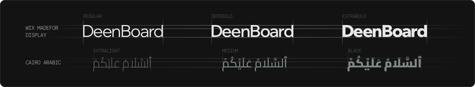 DeenBoard uses Wix Madefor Display for English text and Cairo for Arabic. The modern, simple, and geometric typography reinforces the product’s dual focus on spirituality and productivity.