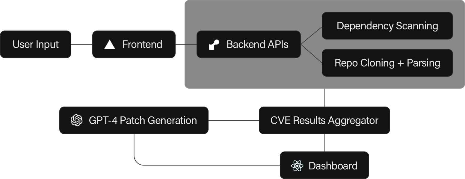 Patchly integrates multiple dependency scanning technologies, such as pip-audit (Python), npm audit (Node.js), OWASP Dependency-Check (Java), and OSV-Scanner (Go, Rust, C++, and more) for optimized environment-based vulnerability detection. Findings are aggregated by a FastAPI backend, enriched with GPT-4 generated fixes, and presented in a responsive Next.js dashboard. This architecture ensures scans are fast, environment-aware, and actionable.